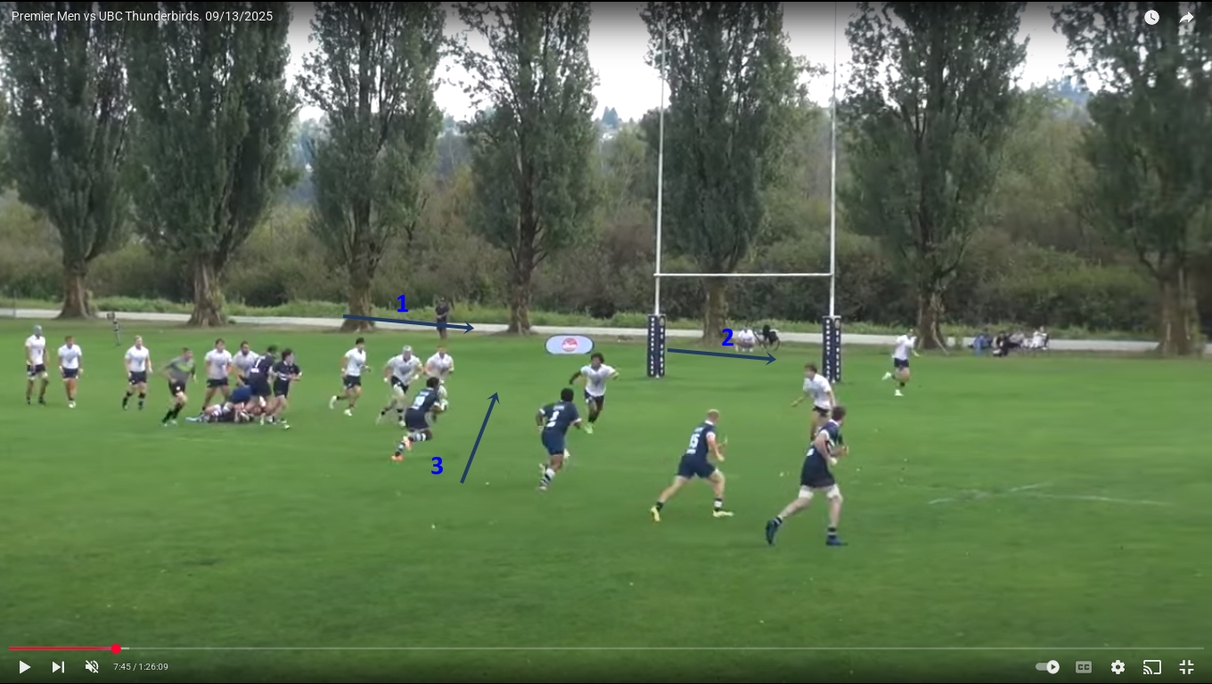 Player 2 has the ball but is well marked, unfortunately he’s not looking to his right to the unmarked player 5. Still there are 3 UBC players in support for a ruck or offload, player 6 is still ahead of the ball. Good things can still happen, how would you play it?
