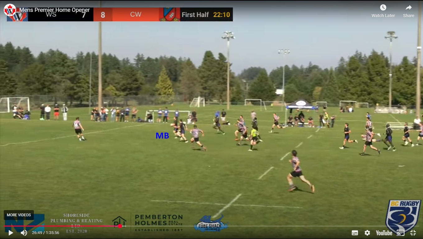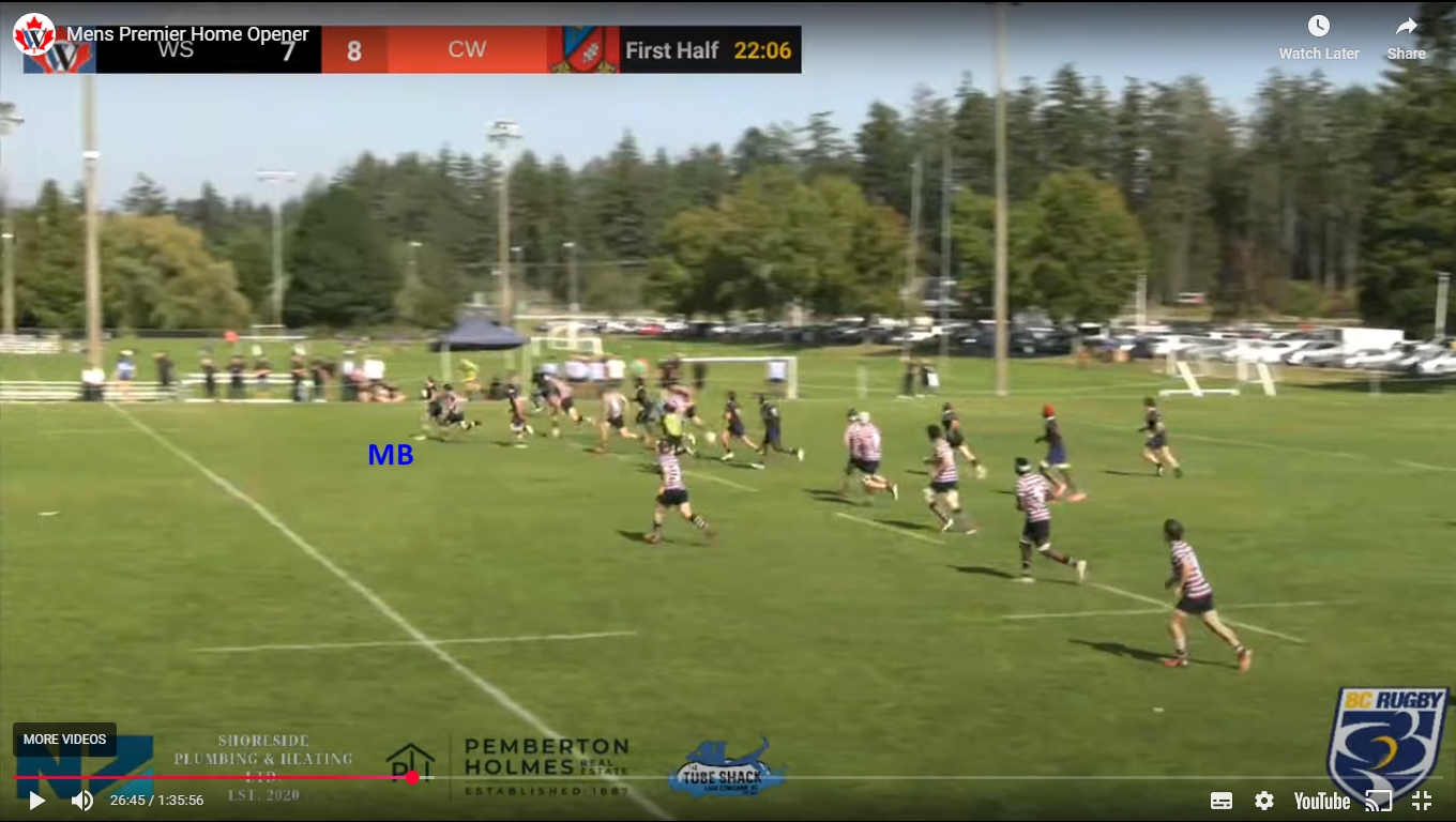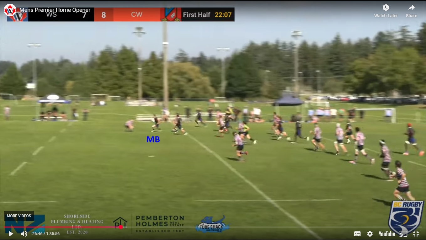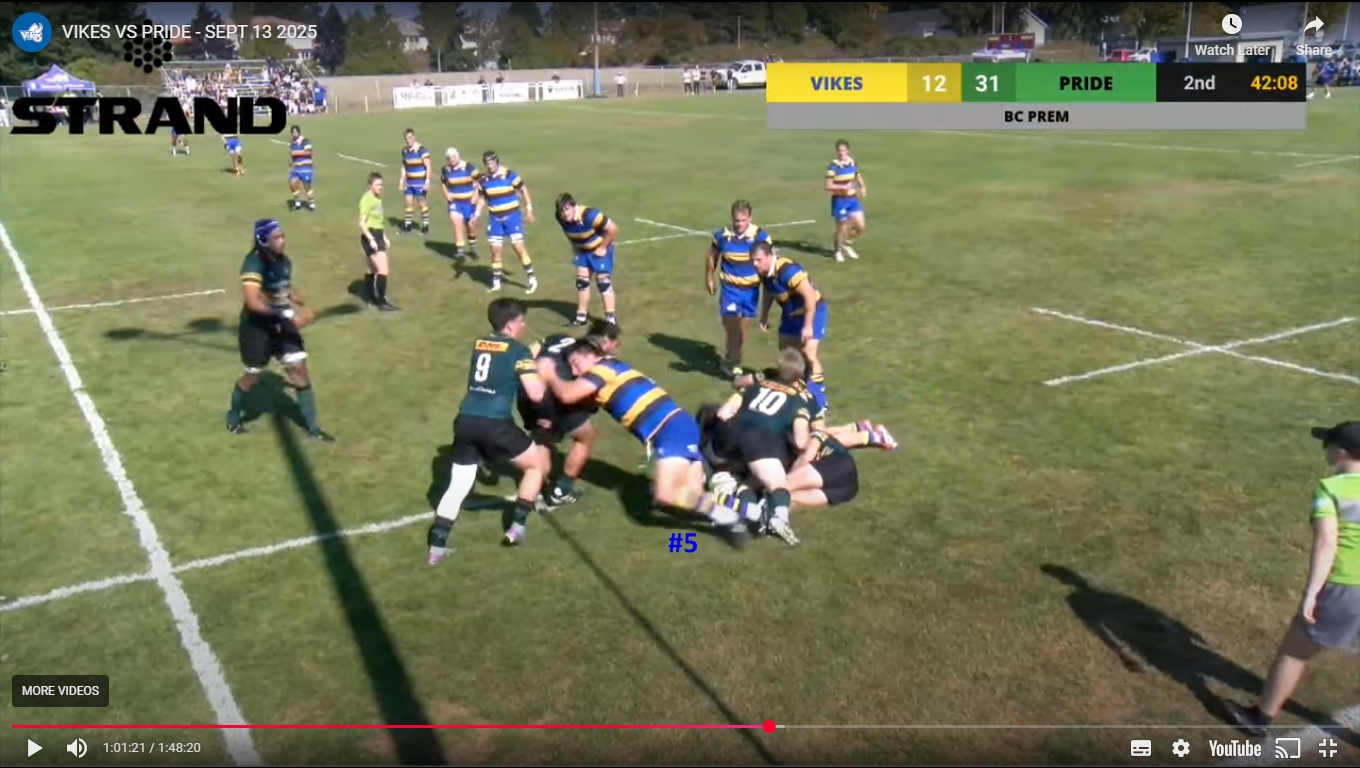 We had a chance to review the match footage of 3 games that were put up on YouTube, kudos to Westshore and UVic for putting up the live streams and archives of the matches, and to Burnaby for putting up the match video post game. We selected a few screen captures from the videos to highlight some outstanding performances. You can view the timestamp on the screen captures to watch on the videos which are included below. The players featured from Week 1 are Burnaby #10 Napolioni Bolaca, Westshore #10 Mark Balaski, UVic’s second row Brendan Kim and centre Morgan di Nardo. All Week 1 impact players.