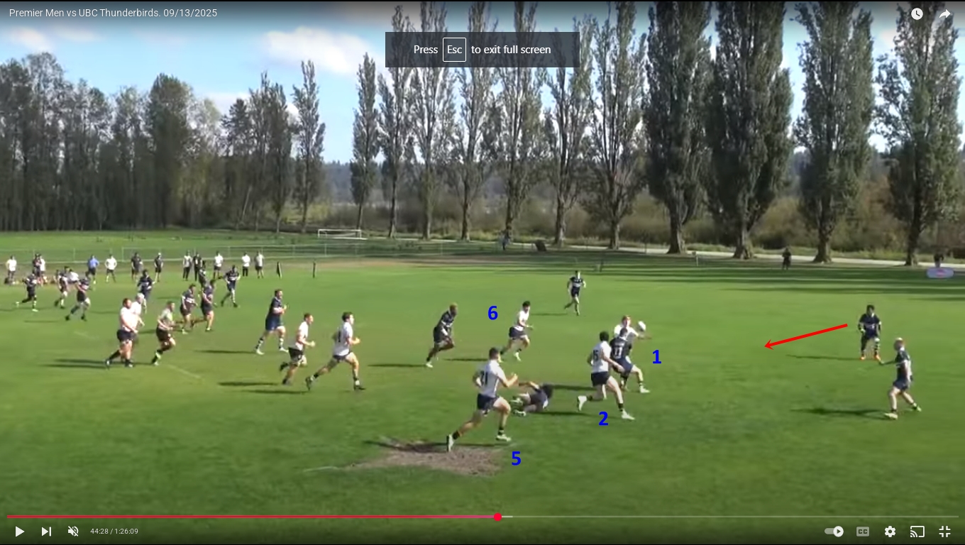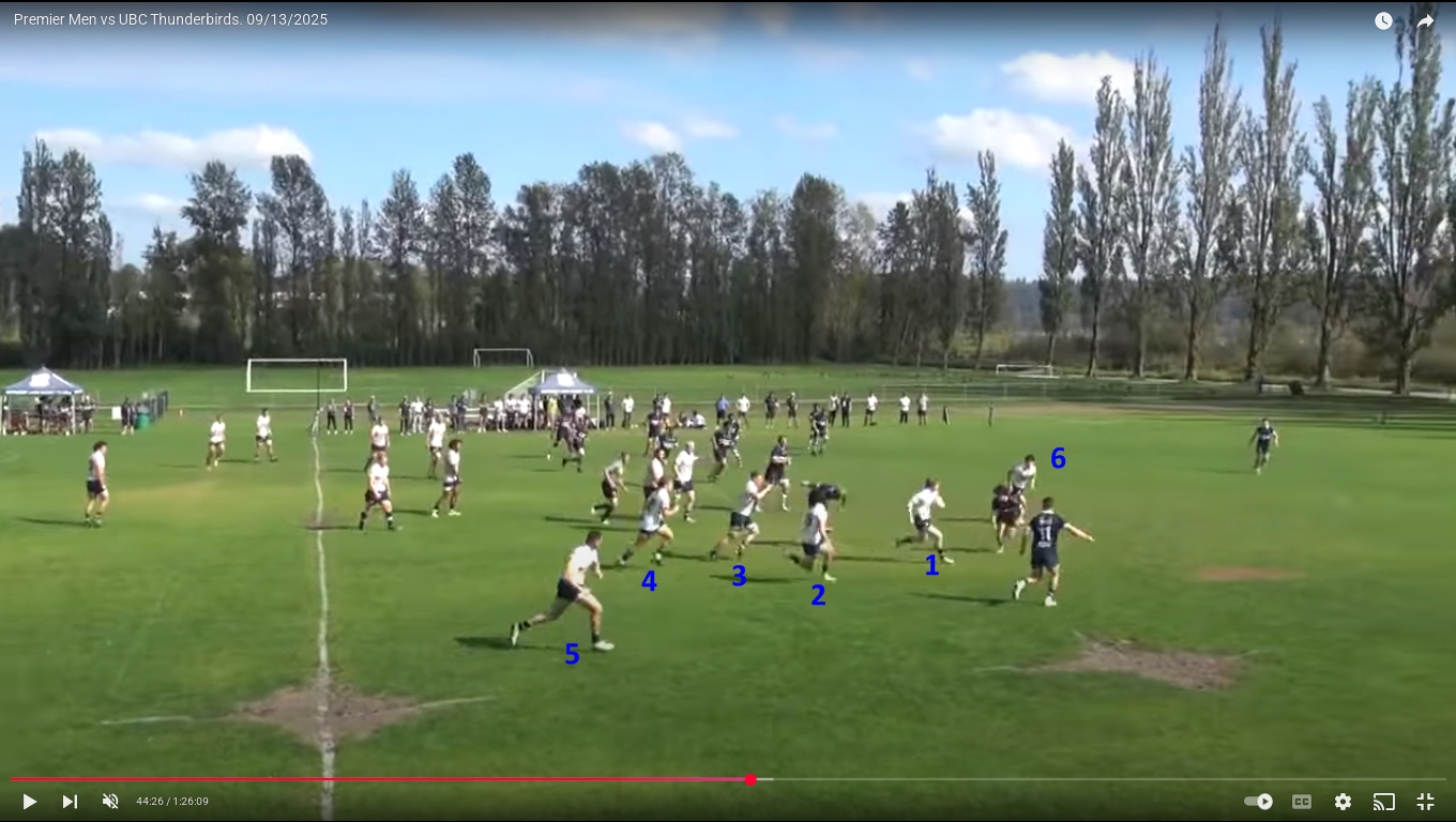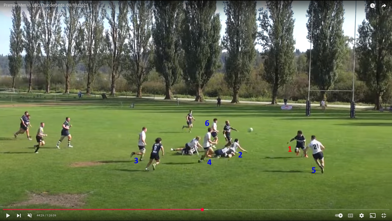 This is the final Bolaca highlight, it covers both defence and attack. UBC are returning a kick and it’s looking promising, player #1 has the ball and he has players labelled 2, 3, 4, 5 with him, player 6 hasn’t retreated from the previous lineout and is out of the play. You look at that and think there’s options, player 5 is the big UBC wing wearing #21, get the ball to him and it’s looking good. However notice the player has the ball tucked under his arm not in two hands so this ball is going nowhere right away.