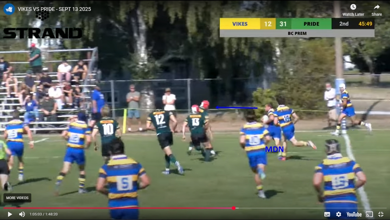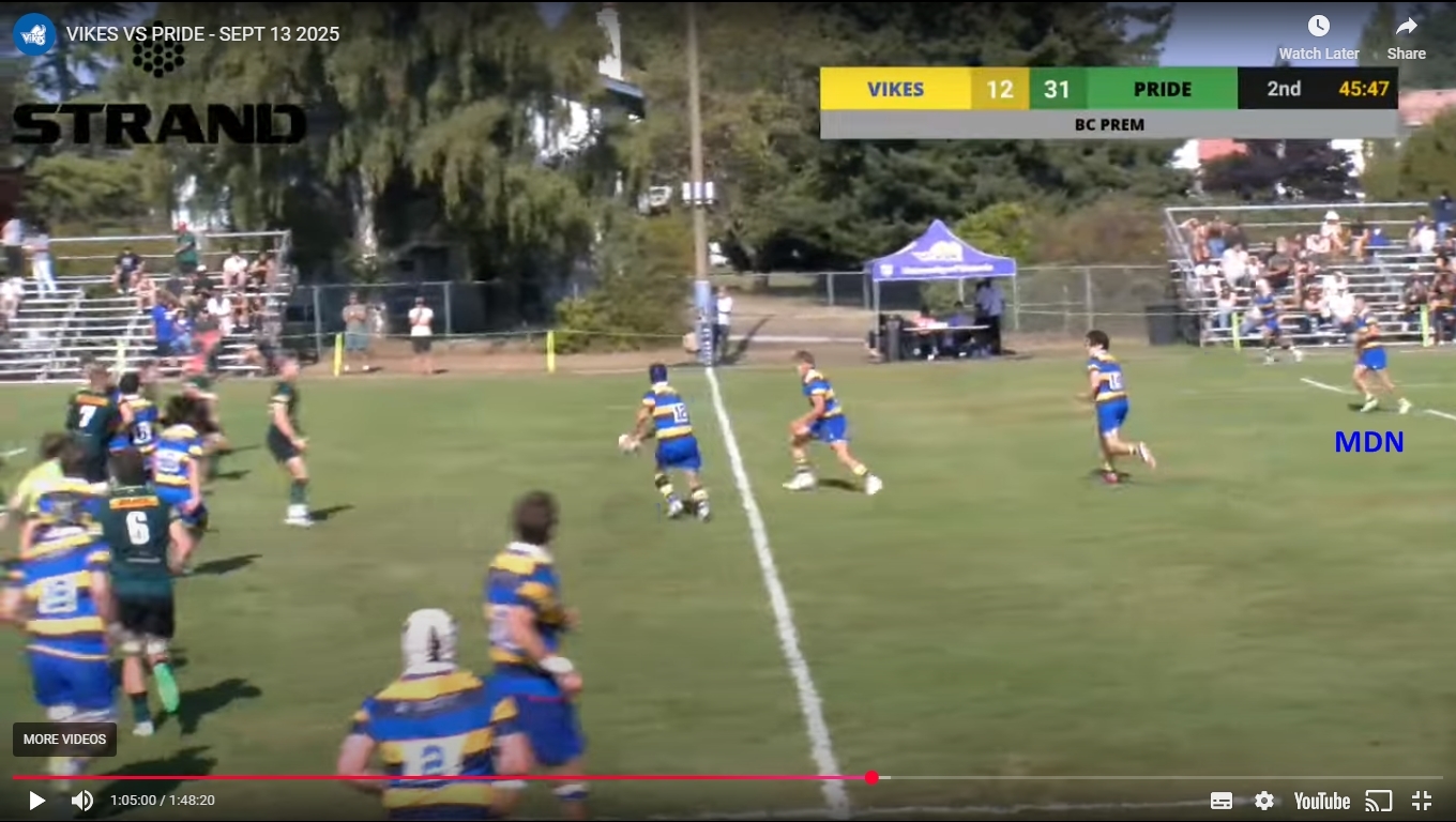On to Morgan di Nardo, who I think was the on form Canada 7s player last season. The Vikes roster said #12 Josh McIndoe but the announcer says Lockhart MacGregor for #12. Either way it’s get the ball to MDN, Morgan di Nardo, when you’re behind 31-12 and he doesn’t disappoint. Out wide is winger, TK, Thoron Koyote, a Cowichan product, also was part of the MacDowell Academy, it’s his first year uni I think. He scored the try, two tries in the match, but it was di Nardo who set it up.