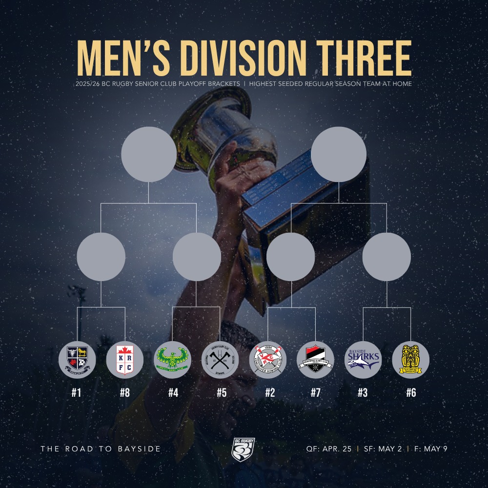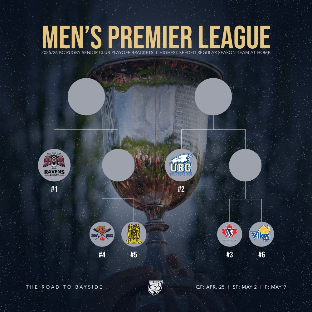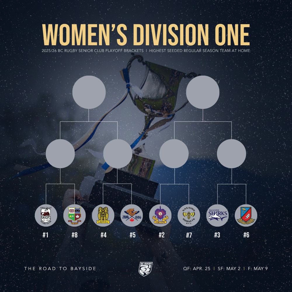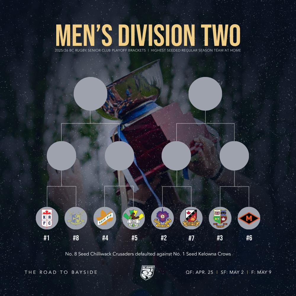 There are 20 quarter-final matches this weekend at 15 locations, there was one default in men’s Div 2. There are double headers at Juan de Fuca, Klahanie, Brockton Oval, South Surrey Athletic Park and Kamloops. The match locations, times and referee assignments are listed below. We’ll do our BC Premier predictions and rosters article on Friday, we’ll also list rosters for other divisions if they’re sent to us, text format preferred, email editor@bcrugbynews.com