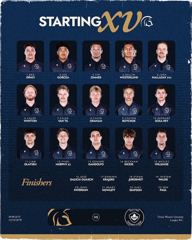 The big news for UVic is on the bench, Cooper Coats wears #22 and will make his appearance somewhere in the backs likely during the second half. He’s apparently doing his medical degree at UVic and if that’s the case he’ll follow the likes of Mark Lawson and Michael Smith on the path from national team player to medical professional. The only change in the forwards is at second row where Muiredach Casey replaces Dane Siebens. In the backs a couple of players come off the bench for startsing roles, Keegan Neary on the wing, and Mason Levin at inside centre. Star U20 player, Josh McIndoe, is apparently getting some rest time to recuperate from a niggling injury.
