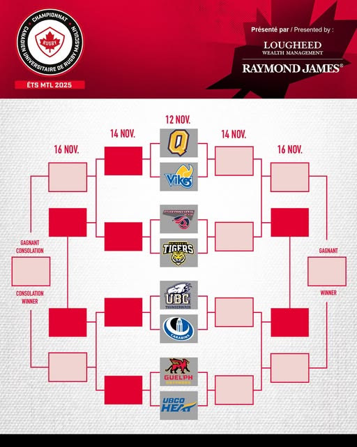 UVic defeated Queen’s in their quarter-final 36-7 and UBC defeated Montreal 40-0 in their quarter-final. Guelph also won their quarter-final over UBC Okanagan 59-0.  ETS defeated Dalhousie 21-3 in their quarter-final. The semi-finals on Friday are now set, UBC v Guelph and UVic v ETS.