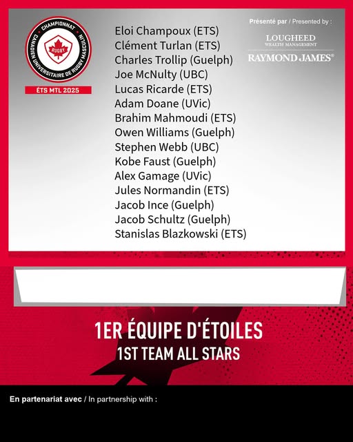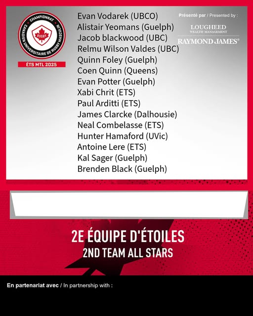Guelph placed 5 players on the 1st team all-star, ETS placed 6 players, UBC and UVic both got 2 selections. On the 2nd team all-starts Guelph again placed 5 players, ETS 4, UBC 2, UVic 1, UBCO 1, Queen’s 1, Dalhousie 1.