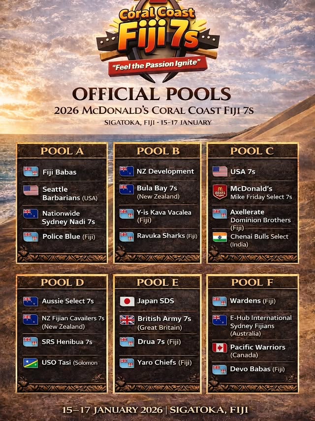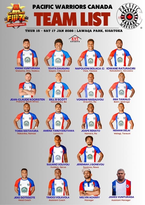 The Coral Coast 7s may be one of the top international 7s tournaments outside the World Rugby SVNS series. It’s based in Fiji and this year there are top teams from Fiji, NZ, Australia, Japan, GB and USA. There’s one team from BC, the Pacific Warriors, who are mostly a Fijian-Canadian team. They won all the major 7s summer tournaments in BC in 2025, the Bayside 7s, the Bula 7s and the Westshore 7s. They’ll be in tough competition in Fiji however, they’re in a pool (Pool F) with two Fijian teams and an Australian Fijian team. Highlighting Pool A are the Fijian Babas, Pool B NZ Development, Pool C the USA 7s team, Pool D Aussie Selects and Pool E Japan SDS. Mike Friday has a Select 7s team that has an all star roster, that includes Terry Kennedy, Harry McNulty and Jordan Conroy from Ireland, Perry Baker from USA, Luke Treharne from Wales and a host of top Fijian players including Jerry Tuwai. We’ll try to get the Pacific Warriors roster to add to this article.