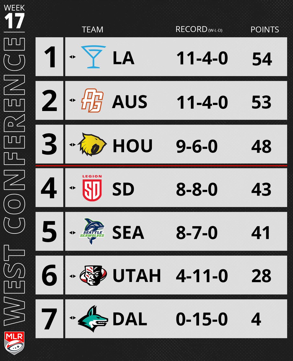 With one week left in the season the playoff teams have been confirmed. In the West LA, Austin and Houston are in the playoffs, in the East New England, Atlanta and New York are in the playoffs. New England have locked up 1st place in the East and will get a 1st round bye in the playoffs. In the West LA and Austin are in a battle for top spot, LA host Seattle and Austin visit Houston in Week 18.