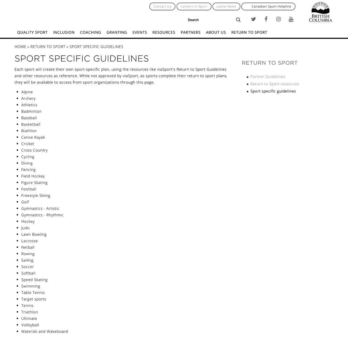 viaSport which is the province’s voice on Return to Sport guidelines has published a list of Provincial Sport Organizations that have submitted Return to Sport Plans (RTSP).
