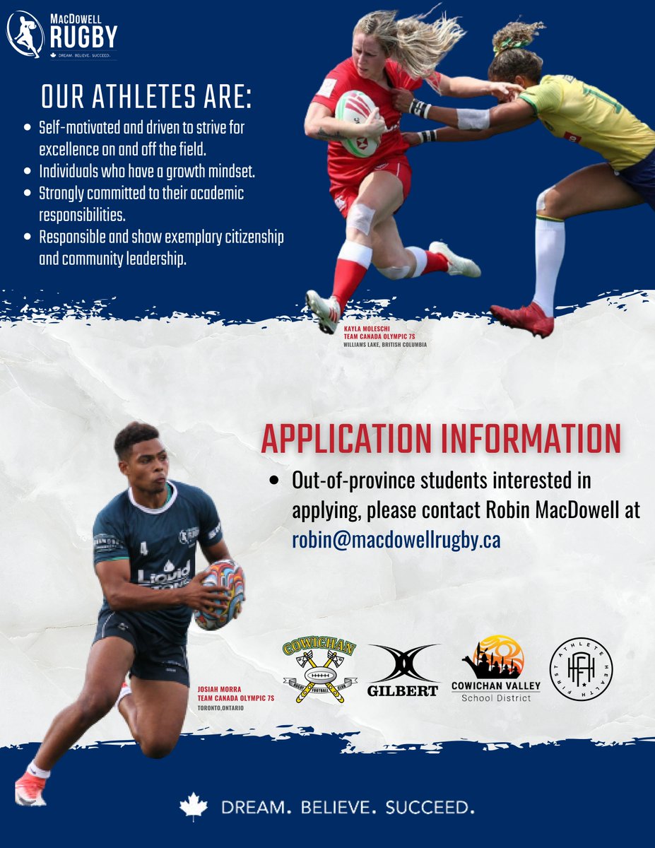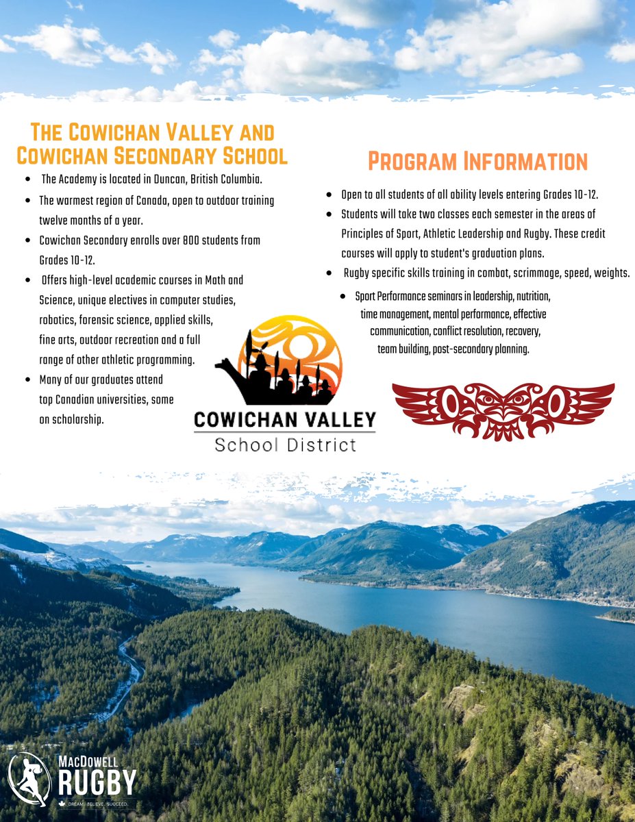 The registration poster for the MacDowell Rugby Academy at Cowichan Secondary School is below. The program starts September 2021 and runs until June 2022. There are instructions for CSS students and BC residents, also separate instructions for Out of Province and International students.