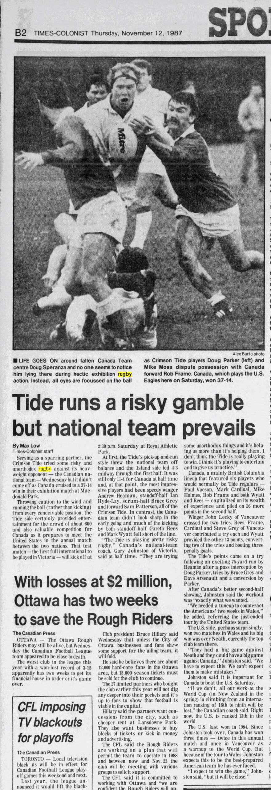 When did the practice of playing rugby on Remembrance Day end in BC, we’re still doing research on that but in 1987 the Tide played Canada on Wednesday November 11th at MacDonald Park. Canada were preparing for their game against the USA on Saturday at Royal Athletic Park, November 14th. Canada would go on to win that match against USA 20-12. In the warm up game against the Tide on November 11th, Canada won 37-14. Tide players on the Canada side included Gareth Rees, Mark Wyatt, Mark Cardinal, Mike Holmes, Paul Vaeson, Rob Frame. At the time Canada were ranked 9th in the world, the USA 13th.
