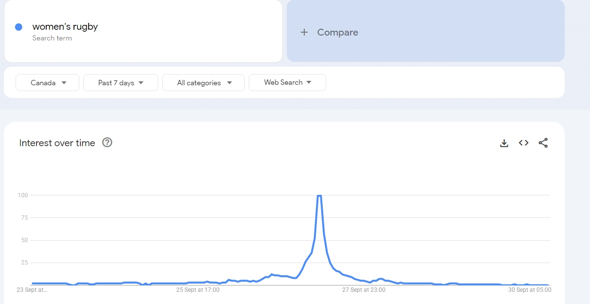 The World Cup is over, Canadian rugby had its brief moment in the sun but now what? How to build on that momentum? That’s the question, there is no simple answer presented in this article but we’ll start with the post-match interview with coach Kevin Rouet and Alex Tessier. Below you will find the video, the summary of the interview, the transcript and a google trend graph that shows the spike that “women’s rugby” enjoyed over the past week.