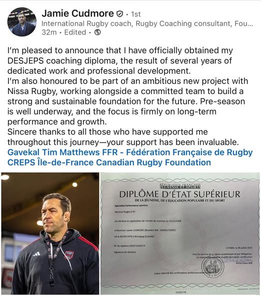 Jamie Cudmore Announced as a Forwards Coach at Nissa Rugby in Nice, France – Completes DESJEPS Postgraduate Coaching Diploma; Josh Thiel Signs with Monaco Rugby